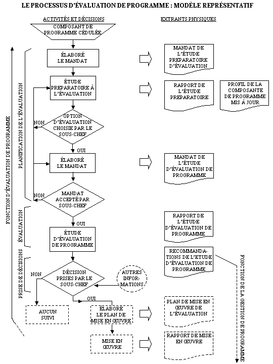 Le graphique 1.1 illustre ce processus, indiquant les activités et les décisions prises normalement de même que les documents produits habituellement. Chaque étape du processus d'évaluation sera brièvement étudiée dans ce chapitre.