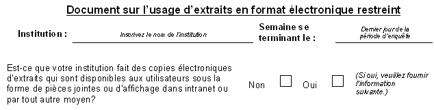 La deuxième étape consiste à préciser si des copies électroniques des extraits sont offertes aux utilisateurs sous forme de pièces jointes à des courriels ou de fichiers accessibles dans l'intranet. Si la case « Non » est cochée, il n'est nécessaire de fournir aucun autre renseignement. Si la case « Oui » est cochée, les autres sections du formulaire doivent être remplies.