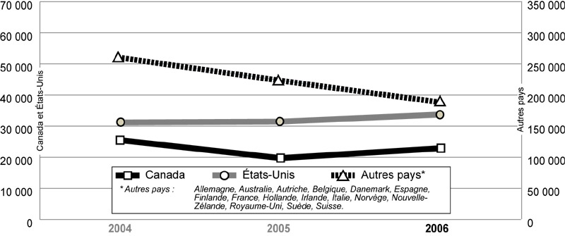 Depuis trois ans, en général, les pays occidentaux constatent une baisse importante et constante du nombre de demandes d'asile qui leur sont présentées. Par contre, au Canada et aux États Unis, le contraire s'est produit : par rapport à 2005, la CISR s'est vu déférer 16 % de plus de demandes d'asile au cours de l'année civile 2006. Pour l'exercice 2006-2007, les demandes d'asile déférées ont dépassé de 12 % le total atteint en 2005-2006 et de 6 % les prévisions établies dans le Rapport sur les plans et les priorités de 2006-2007 de la CISR.