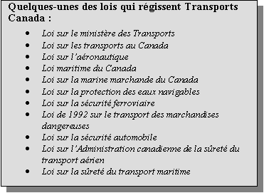 On trouvera une liste exhaustive des lois administrées par Transports Canada sur son site Web : http://www.tc.gc.ca/lois-reglements/listedeslois/menu.htm.