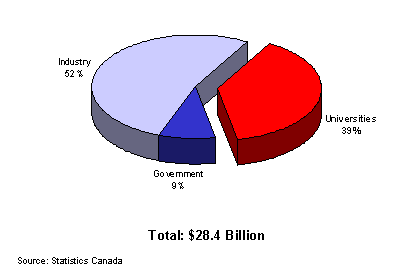 In 2006, university research represented 39% of all Canadian research, as measured by expenditures (see Figure 5). This percentage is much higher than the OECD average of 18% of R&D performed by universities in member countries. Of the $10.9 billion of direct and indirect investment in Canadian university research in 2006, 42% was allocated to the natural sciences and engineering (NSE).