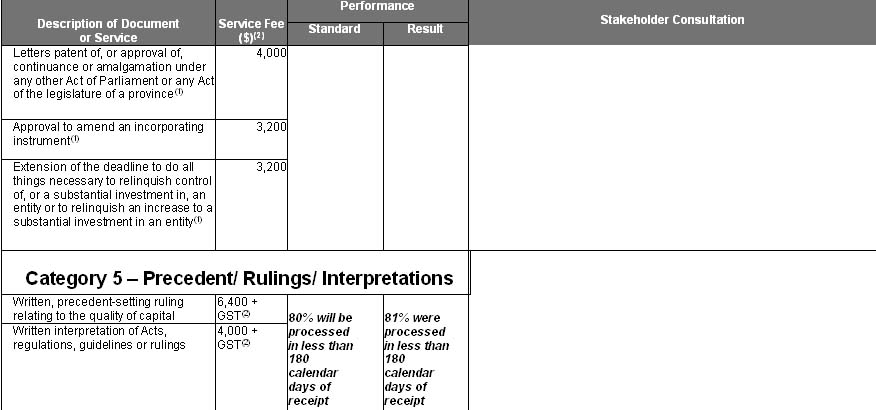 Of note, is that regulations became effective April 28, 2006 that eliminated all user fees except those that are paid by non-Federally Regulated Financial Institutions (non-FRFIs), such as new applicants and foreign banks planning to carry on certain activities in Canada, and those that are charged for rulings, accreditations, interpretations, capital quality confirmations, and copies of corporate documents, which can be time consuming to process and are sometimes outside OSFI’s core businesses. These regulations reduced the number of service charges from 51 to 14. The regulations eliminated the majority of user fees, recognizing that the fees currently do not significantly redistribute OSFI’s costs amongst FRFIs and that the fees do not recover a meaningful percentage of OSFI’s annual costs. In other words, prior to the April 2006 changes, user fees recovered less than four per cent of OSFI’s total regulatory and supervisory costs charged to institutions, and eliminating the majority of service charges has little impact on the total amounts individual FRFIs pay. Charges to non-FRFIs (e.g., new applicants and foreign banks) and for rulings, accreditations, interpretations, capital quality confirmations, and copies of corporate documents are being retained on the basis that charging for these services (which are not part of OSFI’s normal course of regulation and supervision and are often resource intensive to process) represents a more equitable approach to recovering OSFI’s costs associated with those services than would charging these services directly to FRFIs through base assessments. The performance standards associated with the service charges that have been eliminated will be maintained.