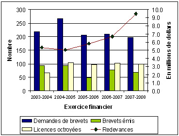 Le partenaire du CNRC qui négocie l’obtention d’une licence d’utilisation d’une des technologies de l’organisme confirme, ce faisant, le mérite de la recherche effectuée au CNRC. Ces contrats de licence contribuent directement à la transformation des innovations en applications commerciales. Le CNRC a conclu 98 nouveaux contrats de licence en 2007-2008 et les redevances touchées sur sa propriété intellectuelle en 2007-2008 se sont élevées à 9,47 millions de dollars (voir la figure 2‑1).