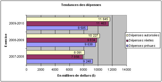 Le graphique ci-dessus illustre l'évolution des dépenses du Commissariat de 2007-2008 à 2009-2010. Depuis 2007-2008, les dépenses de base ont augmenté afin de répondre aux obligations relatives à l'AIPRP et à la vérification interne introduites par la Loi fédérale sur la responsabilité. En 2009-2010, les dépenses réelles ont aussi augmenté, surtout en raison des fonds supplémentaires obtenus pour moderniser et améliorer les procédés administratifs. En 2009–2010, les ressources inutilisées du Commissariat s'élèvent à 182 000 $.