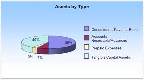 Total assets were $3.411M at the end of 2009-2010, a decrease of $1.848M (35 percent) over the previous year's total assets of $5.259M. Of the total assets, $1.709M (50 percent) were to be received from the Consolidated Revenue Fund. Tangible capital assets represented 40 percent of total assets, while accounts receivable and advances made up 7 percent and prepaid expenses, 3 percent of total assets.