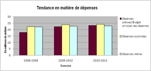 Le budget principal des dépenses et les dépenses prévues du CPVP (qui sont présentés comme un seul et même chiffre puisqu'il n'y a pas de différence notable entre les deux montants) ont augmenté de 1,230 millions de dollars de 2008-2009 à 2009-2010 en raison de l'approbation de nouveau financement. Ces fonds ont servi au traitement des plaintes, à la sensibilisation accrue du public et à la mise en œuvre d'un nouveau projet de vérification interne.