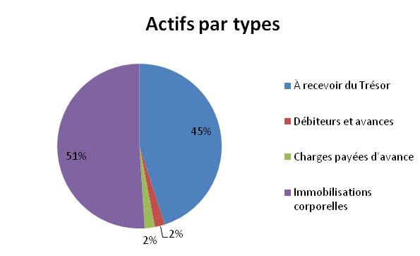 Le total de l'actif est passé de 7,2 millions de dollars (après rajustement) en 2009-2010 à 8,2 en 2010-2011. Une hausse de plus de 0,6 million de dollars est attribuable au montant à recevoir du Trésor. Le reste de la hausse est attribuable aux débiteurs et avances et aux immobilisations corporelles. Les charges payées d’avance sont semblables pour les deux exercices.