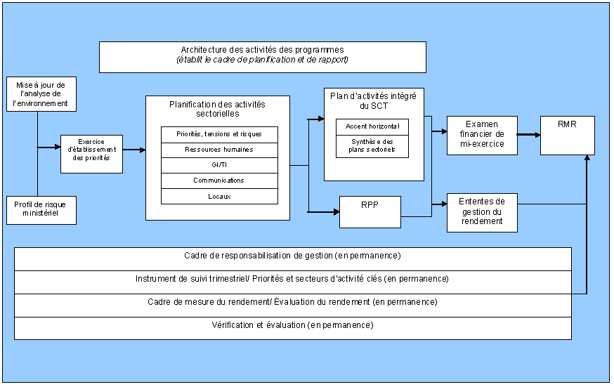 7. Parmi les exemples de points à l'ordre du jour qui sont liés à la gestion des enjeux internes, il y a le Rapport sur les plans et les priorités, le Rapport ministériel sur le rendement, le CRG, la gestion interne des RH, la gestion des talents, la gestion de la GI‑TI et les activités quotidiennes permanentes.