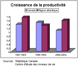 La région doit continuer d’augmenter sa compétitivité générale alors que la concurrence mondiale s’intensifie, particulièrement de pays comme la Chine et l’Inde. Pour augmenter la compétitivité de la région, il faudra accroître de façon soutenue les niveaux de productivité. La croissance de la productivité du Canada atlantique était bonne au cours des dernières années; toutefois, la productivité de la main-d’œuvre se situe toujours à 86 % du niveau national. La productivité du secteur de la fabrication, quant à elle, se situe à 76 % du niveau national.