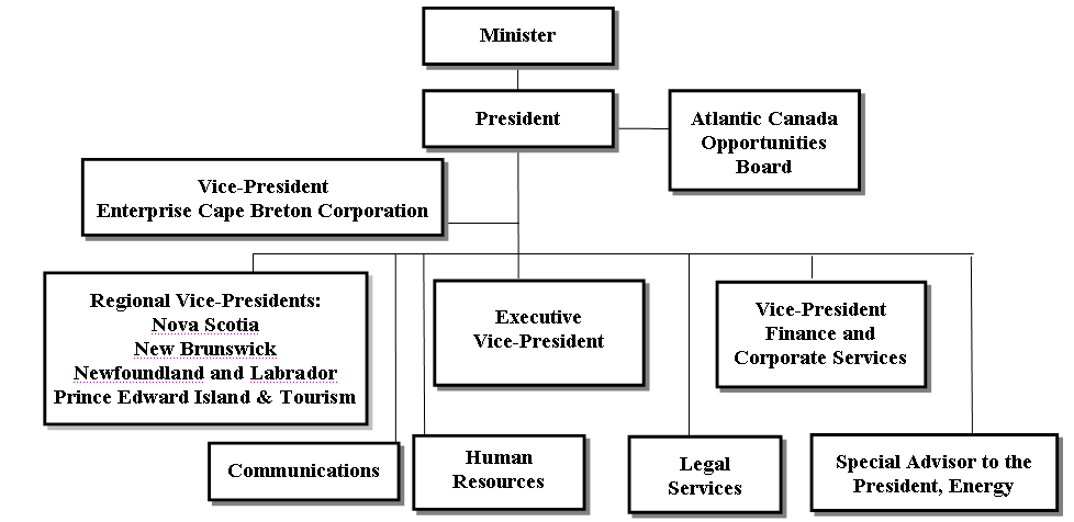 More information on people in charge and the organizational structure of ACOA may be found at: http://www.acoa-apeca.gc.ca/e/about/people.shtml.