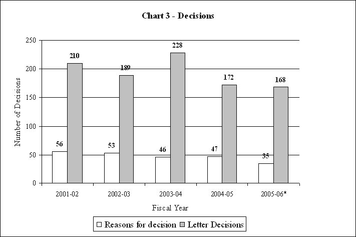 The Board's experience of issuing Reasons for decision and letter decisions in the last five fiscal years is reflected in Chart 3. On average, the CIRB has issued close to 50 Reasons for decision each year over the last five years, and close to 200 letter decisions. The balance of matters are either withdrawn or disposed of by orders. In the five fiscal years before the Code amendments, the Board issued an average of 35 Reasons for decision per year and 130 letter decisions.