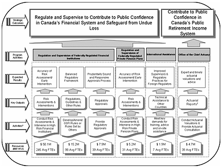 The following diagram shows how OSFI's activities, key outputs and expected results are linked to strategic outcomes.