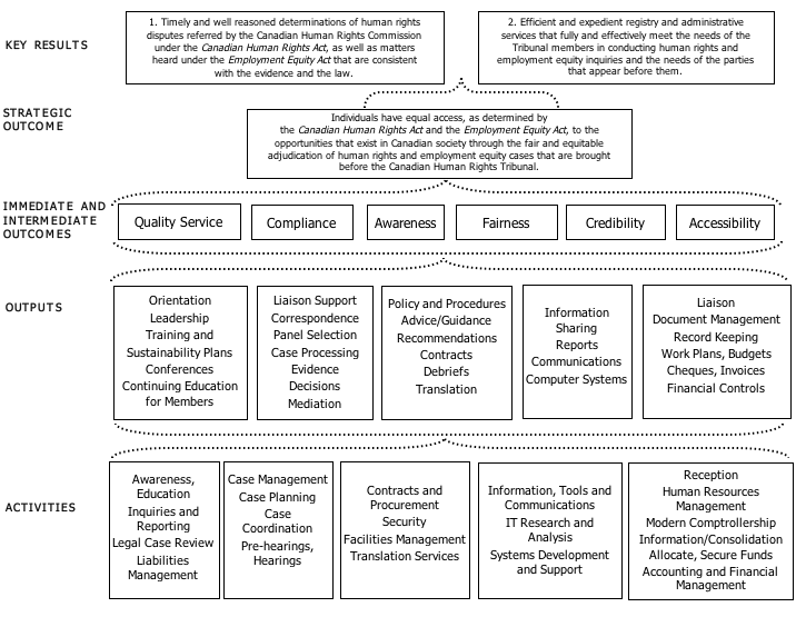 The Tribunal's two program activities (described below), together with its management and corporate administration activities, achieve these strategic outcomes and results for Canadians as shown in the logic model (Figure 2.1).