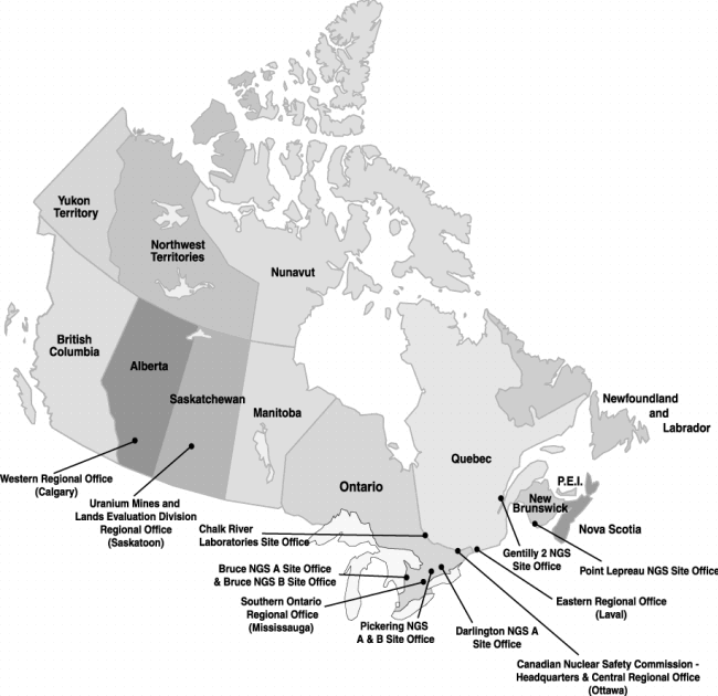The staff organization consists of a headquarters in Ottawa, site offices located at each of the five nuclear generating stations in Canada, a site office at Atomic Energy of Canada's Chalk River Laboratories and five regional offices. CNSC staff is permanently located at each nuclear generating station in Canada and at Chalk River to assess performance against regulations and specific conditions of operating licences. Regional offices conduct compliance activities for nuclear substances, transportation, radiation devices and equipment containing nuclear substances. They also respond to unusual events involving nuclear substances.