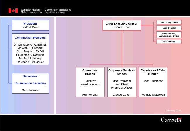 The NSCA provides for the appointment of up to seven Commission members by the Governor in Council serving at good behaviour. Six members serve as permanent members for a term not exceeding five years. One member of the Commission is designated as the President of the Commission. This position is currently held by Linda J. Keen.