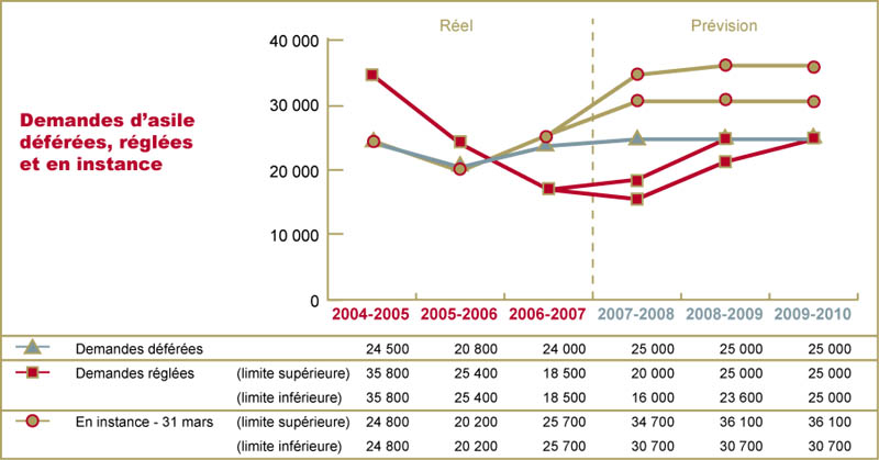 L'augmentation du nombre de demandes d'asile déférées et le nombre peu élevé de demandes d'asile réglées en 2006-2007 a rendu en partie moins importante la réduction du nombre de demandes d'asile en instance en 2005 2006 et au cours des années précédentes. Étant donné que le nombre de cas déférés devrait à nouveau dépasser celui de cas réglés en 2007-2008, il devrait y avoir jusqu'à environ 34 700 cas en instance à la fin de l'exercice 2007-2008. Davantage de ressources pourraient être nécessaires au cours des prochaines années pour que le nombre de cas en instance puisse diminuer considérablement.