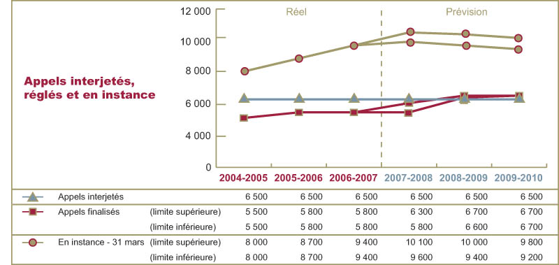 On prévoit que le nombre de cas en instance continuera à croître à court terme, de sorte que de 9 600 à 10 100 appels seront en attente d'une décision d'ici la fin de l'exercice 2007-2008. D'autres ressources pourront être nécessaires au cours des prochaines années pour arriver à une diminution importante du nombre de cas en instance.