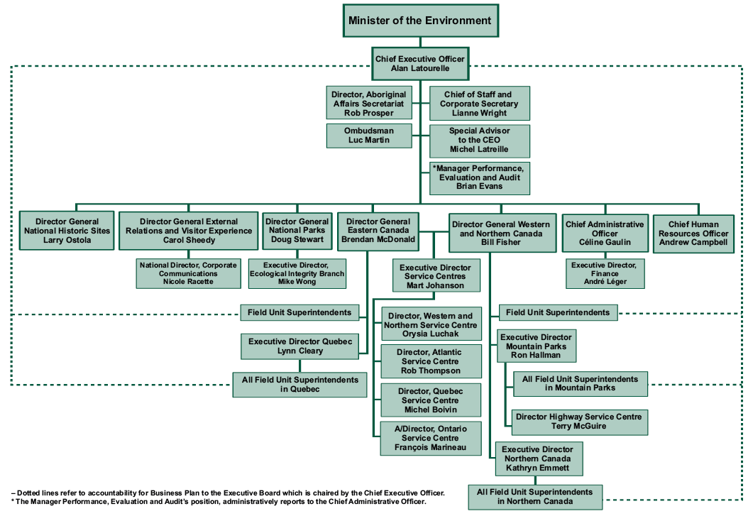 Parks Canada’s Executive Board, comprised of the Chief Executive Officer and other senior managers depicted in the following Organization Chart, sets the priorities for the organization. Program delivery is the responsibility of Parks Canada’s 32 field units. Field units are groupings of national parks, national historic sites and national marine conservation areas. There are four service centres, which support the organization in a variety of professional and technical disciplines, such as biology and archaeology.