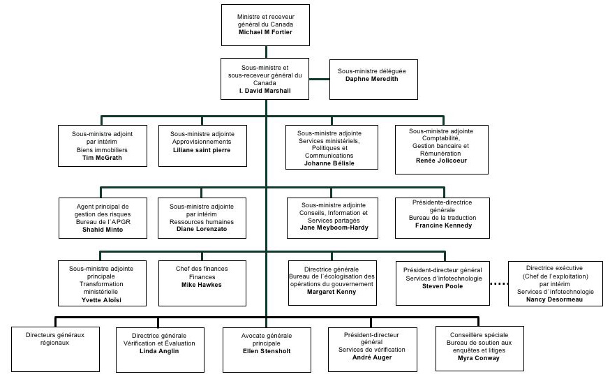 Les tableaux de la présente section correspondent à l’Architecture des activités de programmes du Programme des services gouvernementaux de TPSGC, qui comprend les deux résultats stratégiques du Ministère : les services de qualité et la saine intendance. L’organigramme de TPSGC figure ci-dessous
