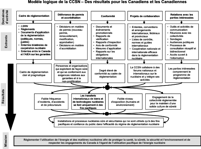Le cadre stratégique de la CCSN est harmonisé avec la Structure de gestion des ressources et des résultats prescrite par le Conseil du Trésor pour la gestion des ressources et la planification pangouvernementales, et il est basé sur le modèle logique de la CCSN, illustré à la Section III. La CCSN cherche à réaliser son résultat stratégique par l'intermédiaire d'une seule activité de programme : la réglementation nucléaire. Cette activité est subdivisée en cinq programmes clés (ou sous-activités) qui sont harmonisés avec les secteurs d'activité du modèle logique.