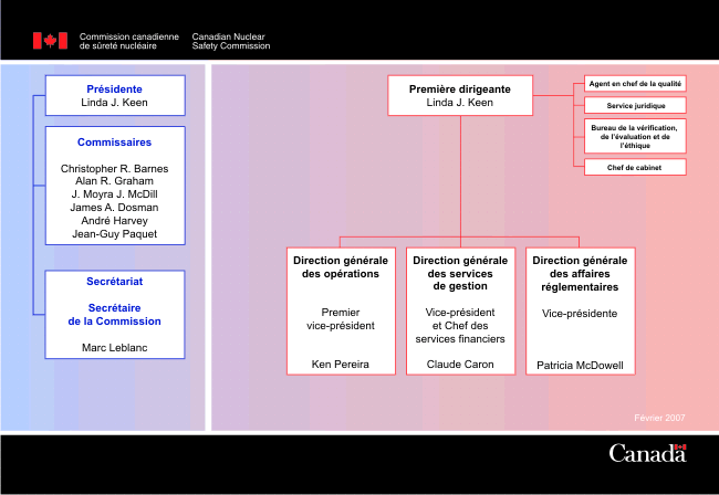 La Commission canadienne de sûreté nucléaire est un tribunal administratif quasi judiciaire indépendant et un organisme de réglementation fédéral. La CCSN est un établissement public nommé à l'annexe II de la Loi sur la gestion des finances publiques et elle relève du Parlement par l'entremise du ministre des Ressources naturelles. À titre de tribunal, la Commission établit l'orientation des politiques globales d'application de la réglementation, prend des règlements et rend des décisions sur les demandes importantes de permis, de renouvellement de permis et les demandes connexes. Les commissaires, qui sont nommés par le gouverneur en conseil, sont distincts du personnel de la CCSN, afin que le tribunal puisse prendre en toute indépendance des décisions relatives aux permis et aux questions connexes.