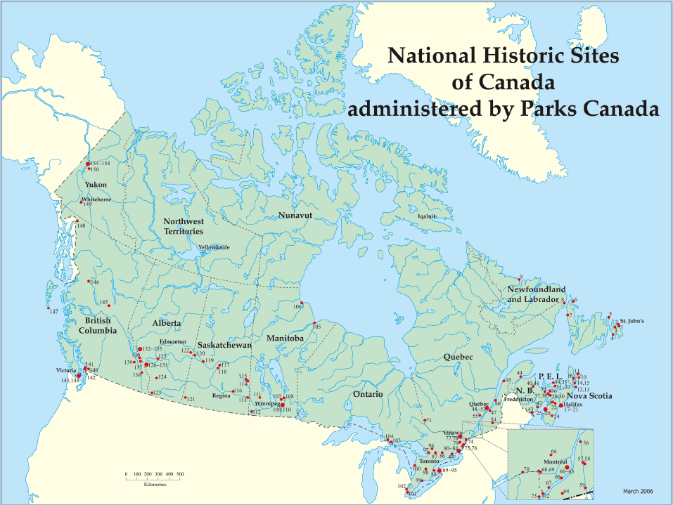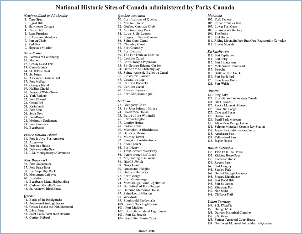 There were 916 sites designated as being of national historic significance as of March 31, 2006. Of these, 154 are directly administered by Parks Canada. Designations have been made for 587 persons of national historic significance and 360 historically significant events. There are 42 national parks representing 28 of Canada’s 39 distinct natural regions, and there are two operating sites in the national marine conservation areas system, representing two of Canada’s 29 marine regions.