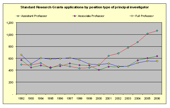 The future growth and international impact of Canadian research depend to a large extent on new scholars, whose role is all the more important in the context of major faculty renewal in Canadian universities. A number of studies document that Canadian research granting agencies are already experiencing the effects of faculty renewal — huge numbers of new hires and expectations that these faculty will be active in research create pressure on granting-agency budgets. Indeed, between 2000 and 2006, SSHRC applications by new scholars increased by 102 per cent. Between 1996 and 2006, applications by researchers at the assistant professor level increased markedly, while applications by full professors remained stable or declined (see Figure 1).