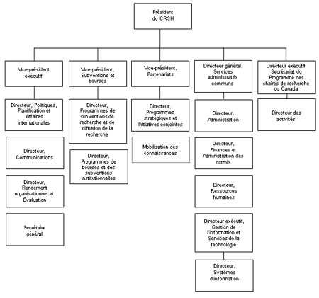 Selon la structure organisationnelle du CRSH, les activités de programme sont gérées par les membres de la haute gestion (figure 4). En tant que premier dirigeant, le président du CRSH voit à l’administration générale des fonds publics et à l’exécution du vaste mandat du Conseil. Le vice-président exécutif, le vice-président des Subventions et des Bourses, le vice-président des Partenariats, le directeur général des Services administratifs communs et le directeur exécutif du Secrétariat du Programme des chaires de recherche du Canada rendent compte au président et sont responsables des sous-activités de programme de leur portefeuille respectif.