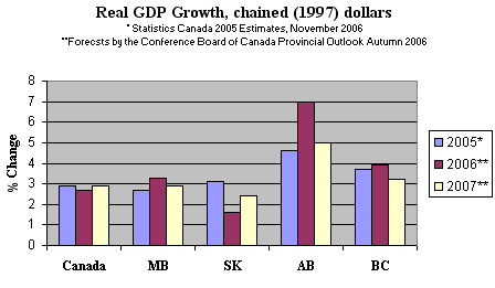 Since 2003, real Gross Domestic Product (GDP) growth in Saskatchewan, British Columbia and Alberta has met or exceeded the national growth rate, and the rate of real GDP growth in Manitoba has steadily increased. GDP growth in Alberta and British Columbia is forecast to continue to exceed the national average through 2007, with lower rates of growth in Saskatchewan and Manitoba.