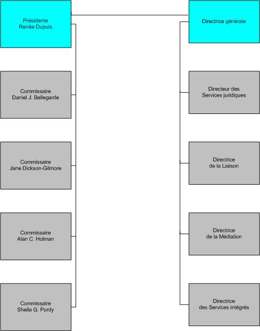 La CRPI est actuellement composée d'une présidente à temps partiel et de quatre commissaires à temps partiel. Les commissaires sont appuyés dans leur travail par le personnel de la Commission, dirigé par une directrice générale. Le Comité de gestion est composé de la directrice générale, du directeur des Services juridiques, de la directrice de la Liaison, de la directrice de la Médiation et de la directrice des Services intégrés.