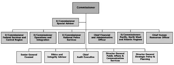 In accordance with the RCMP Act, the RCMP is headed by the Commissioner, who, under the general direction of the Minister of Public Safety, has the control and management of the Force and all matters connected therewith. Key components of our management structure include: