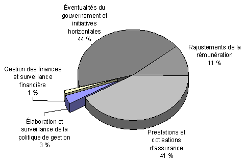 Comme l'illustre le graphique qui suit, la plus grande partie de ces dépenses (4 615 millions de dollars) sont liées au fonds centralisé que le Secrétariat administre pour l'ensemble du gouvernement afin d'accorder des crédits supplémentaires aux ministères et organismes, ainsi qu'aux sociétés d'État qui doivent assumer les frais des initiatives horizontales, pour les éventualités du gouvernement, y compris les besoins en matière de rémunération comme les indemnités de cessation d'emploi et les prestations parentales, les rajustements de la rémunération en cours d'exercice, ainsi que les pensions, les prestations et les cotisations d'assurance de la fonction publique.