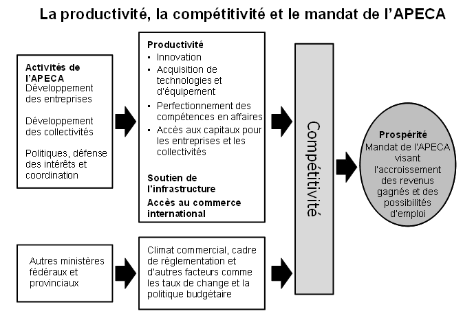 Ensemble, les trois activités de programme, c’est-à-dire Développement des entreprises, Développement des collectivités ainsi que Politiques, défense des intérêts et coordination, permettent à l’Agence d’atteindre son résultat stratégique ayant trait à la compétitivité de l’économie du Canada atlantique. En mettant l’accent sur la productivité, les différents programmes et activités de l’APECA visent à aider le Canada atlantique à prospérer et à être concurrentiel à l’échelle internationale.