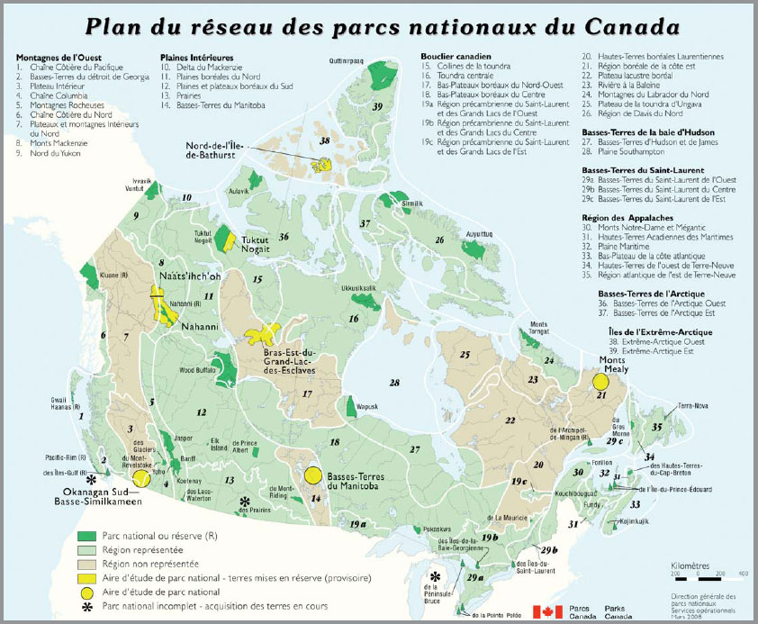 L’objectif à long terme de Parcs Canada est de créer au moins un parc national et une aire marine nationale de conservation dans chacune des régions terrestres et marines du pays. Le réseau des parcs nationaux (figure 1) représente les régions terrestres du Canada. Le 31 mars 2008, 28 des 39 régions terrestres du Canada étaient