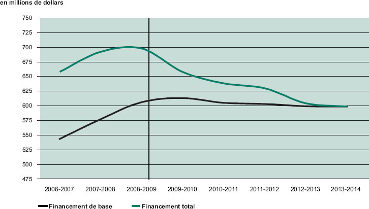 Comme le montre la figure 5, depuis l’exercice 2006-2007, le niveau de financement de base de Parcs Canada avait continué d’augmenter grâce à de nouveaux fonds alloués pour l’amélioration de l’intégrité écologique dans les parcs nationaux, la protection des espèces en péril, l’Initiative des endroits historiques et la recapitalisation. L’apport de nouveaux fonds se stabilise en 2009-2010. De plus, en 2008-2009, 8 M$ a été réalloué à Parcs Canada pour la suppression des feux de forêts. Étant donné le nombre moins élevé de feux de forêts durant l’été et des conditions météorologiques particulièrement humides, 6 M$ de ce montant a été dépensé en 2008-2009 et 2 M$ sera reporté à l’année financière 2009-2010.