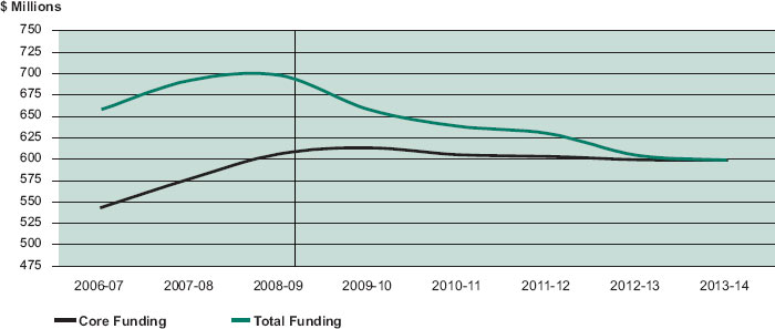 Figure 5 illustrates Parks Canada’s funding level trend from 2006-07 to 2013-14. Two trends are represented: the core funding and the total funding.