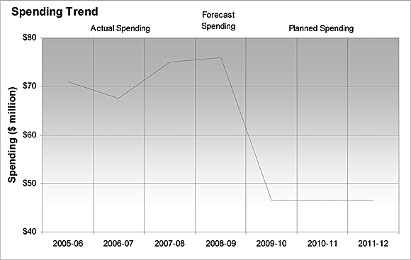 The figure below illustrates the CGC’s spending trend from 2005-06 to 2011-12. The CGC has approval to spend $46.6 million for the 2009-10, 2010-11, and 2011-12 fiscal year. This includes the annual appropriation of $5.2 million and projected respendable revenue. In previous years, additional funding has been approved on an annual basis to support the CGC. However, the additional funding which is being sought for 2009-2010 is not included in planned spending as it will be accessed via Supplementary Estimates, subject to parliamentary approval. Consequently the year over year comparison reflects only the funding approved at the time the Main Estimates for 2009-10 were prepared.