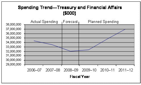 Treasury and Financial Affairs includes domestic coinage and interests and other costs related to the public debt. The variation in actual spending from 2006–07 to 2007–08 is mostly due to lower interest rates and reductions in market debt. The forecast and planned spending vary depending on the forecast interest rates.