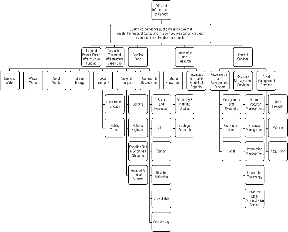 Figure 2 illustrates the Program Activity Architecture of the department, which depicts the structure of Infrastructure Canada’s program activities, sub-activities and sub-sub-activities, whose aim is to clarify how the organization manages the diverse set of programs and activities under its control to move forward the achievement of its strategic outcome.
