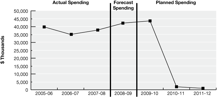 For the 2005-06 to 2007-08 periods, total spending includes all Parliamentary appropriation sources: Main Estimates, Supplementary Estimates, Treasury Board Vote 10, 15 and 22. It also includes carry-forward adjustments. For the 2009-10 to 2011-12 periods, the total spending corresponds to the planned spending including the new infrastructure funds announced in Budget 2009.