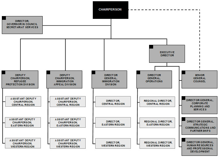 Senior management. The Chairperson is the IRB's Chief Executive Officer, senior decision-maker and spokesperson. The Executive Director is the IRB's Chief Operating Officer and is responsible for providing adjudicative and corporate support to the IRB's three decision-making divisions. Two deputy chairpersons (appointed by the GIC) and one director general (appointed under the Public Service Employment Act) oversee decision-making in the three divisions. Four directors general and a senior general counsel (all appointed under the Public Service Employment Act) are responsible for the IRB's operations, legal services, corporate planning and services, communications and human resources functions.