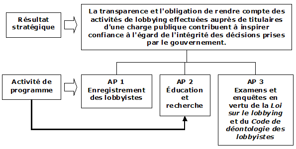Sommaire de l'activité de programme : La Loi sur le lobbying confère au commissaire au lobbying un solide mandat en vue d'établir et de mettre en œuvre des programmes d'éducation et de sensibilisation, afin d'assurer que les activités de lobbying menées au niveau fédéral soient exercées de façon éthique et transparente. L'activité de programme d'éducation et de recherche inclut notamment l'élaboration et la mise en œuvre d'une stratégie d'éducation et de sensibilisation visant à assurer que les lobbyistes, leurs clients, les titulaires d'une charge publique ainsi que le public comprennent bien les nouvelles exigences d'enregistrement prévues par la Loi sur le lobbying, de façon à assurer un plus grand respect de la Loi sur le lobbying et le Code de déontologie des lobbyistes.