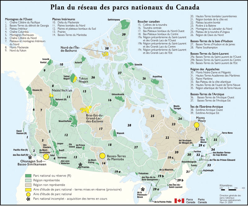 L'objectif à long terme de Parcs Canada est de créer au moins un parc national et une aire marine nationale de conservation dans chacune des régions terrestres et marines du pays. Le réseau des parcs nationaux (figure 1) représente les régions terrestres du Canada. Le 31 mars 2009, 28 des 39 régions terrestres du Canada étaient représentées par 42 parcs nationaux, ce qui signifie qu'un peu plus de 70 pour 100 du réseau est maintenant achevé. Ces 42 parcs protègent plus de 300 000 kilomètres carrés de terres canadiennes.