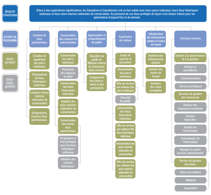 La figure 4, à la page suivante, présente le résultat stratégique et l'architecture des activités de programmes (AAP) révisée de Parcs Canada. Parmi les changements mineurs apportés à l'AAP depuis l'année dernière, les titres de deux sous-activités ont été changés : Diffusion externe éducative et communications externes s'intitule désormais Éducation du public en diffusion externe et communications externes sous Appréciation et compréhension du public, tandis que Marketing et Promotion, s'intitule désormais Étude de marché et promotion sous Expérience du visiteur.