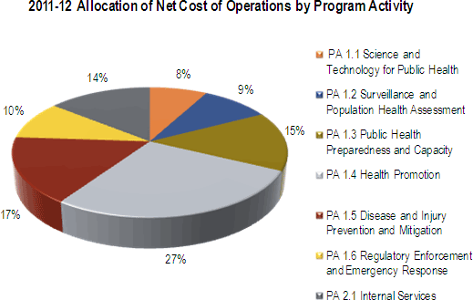 Breaking down the $678.9M of Agency expenses by Program Activity allocates: $53.8M to Science and Technology for Public Health (PA 1.1); $64.2 to Surveillance and Population Health Assessment (PA 1.2); $100.3M to Public Health Preparedness and Capacity (PA 1.3); $186.2M to Health Promotion (PA 1.4); $111.9M to Disease and Injury Prevention (PA 1.5); $65.6M to Regulatory Enforcement and Emergency Response (PA 1.6); and $96.8M to Internal Services (PA 2.1).
