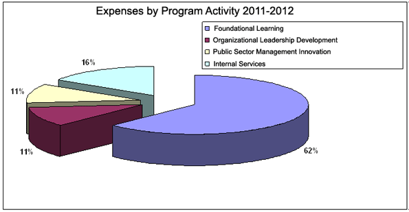 Foundational Learning program activity will account for $76,298 thousand or 62% of the total expenses. Organizational Leadership Development expenses are forecast at $12,846 thousand or 11% of the total expenses, and it is anticipated that Public Sector Management Innovation will use $12,995 thousand or 11% of the total expenses. The remaining amount of $19,152 thousand or 16% of the total planned expenses will fall under the Internal Services program activity.