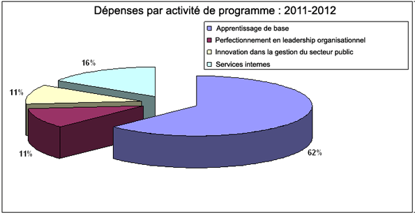 Une somme de 76 298 milliers de dollars sera consacrée à l'activité de programme de l'apprentissage de base, soit 62 % du total des charges. Les charges projetées pour le perfectionnement en leadership organisationnel s'élèvent à 12 846 milliers de dollars ou 11 % du total des charges, et il est prévu qu'une somme de 12 995 milliers de dollars sera affectée à l'innovation dans la gestion du secteur public, soit 11 % du total des charges. La somme restante de 19 152 milliers de dollars, soit 16 % du total des charges prévues, sera consacrée à l'activité de programme des services internes.