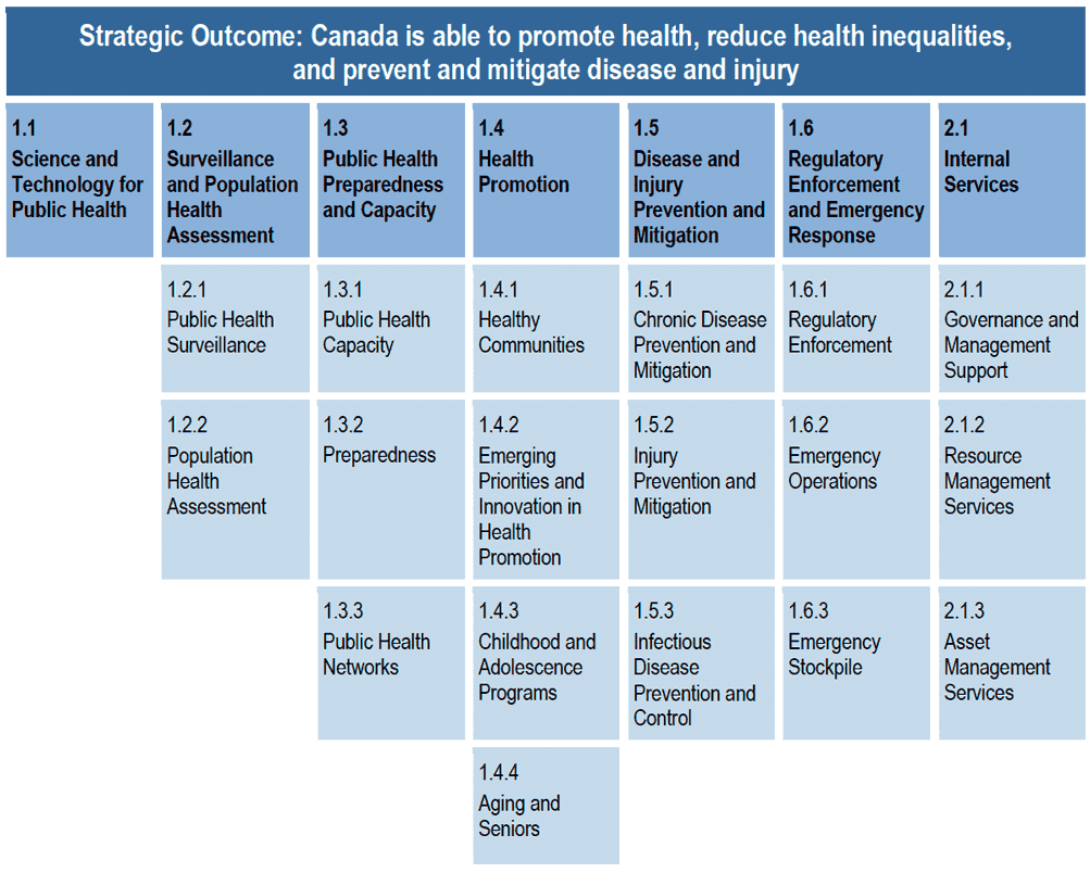 The Agency aims to achieve a strategic outcome of the promotion of health, reduced health inequalities, and the prevention and mitigation of disease and injury, supported by its Program Activity Architecture depicted in the following figure.
