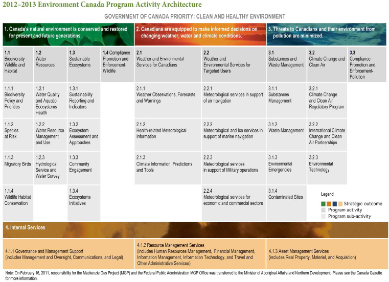 All of the Department’s Strategic Outcomes, Program Activities and internal services activities are illustrated within Environment Canada’s 2012–2013 Program Activity Architecture (PAA) shown below.Environment Canada maintains four organizational priorities for 2012–2013: