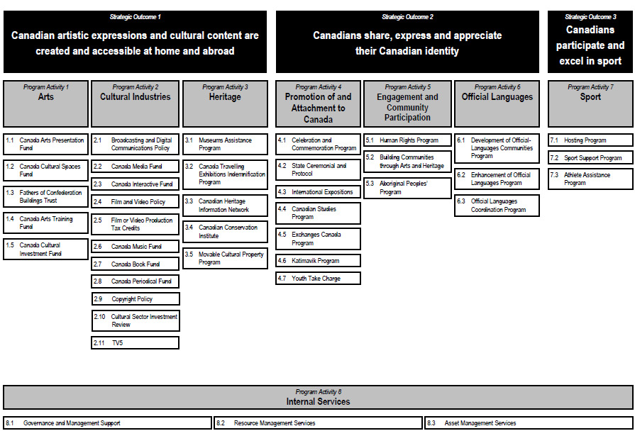The Program Activity Architecture (PAA) illustrates how the Department's programs and activities are linked and how their expected results are organized in order to achieve the Department's strategic outcomes and mandate. A Performance Measurement Framework (PMF) has been developed to serve as an objective basis for collecting information related to the intended results of the Department's programs.The 2012-13 Report on Plans and Priorities is based on the PAA and the expected results and performance indicators identified in the PMF.